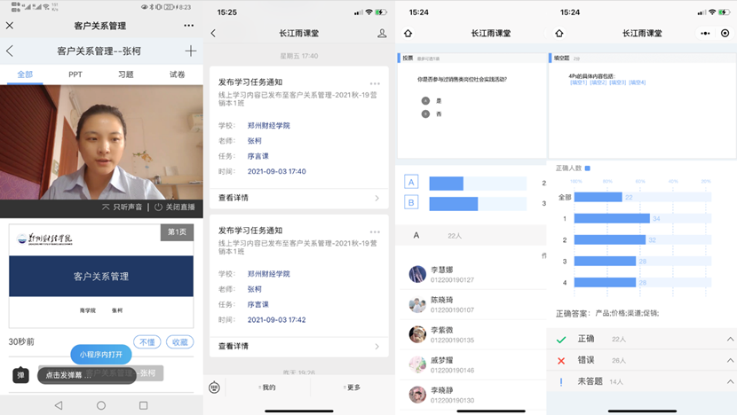 在《客户关系管理》《搜索引擎营销》《新零售》等课程中,任课教师张柯、王小可、周倩使用雨课堂、腾讯会议进行直播教学,将教学任务在课前发布,引导学生自学,在线教学中使用投票、答题等即时互动项目,提高学生课堂注意力,加强学生对教授内容的理解和巩固。