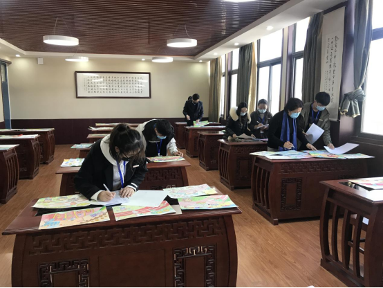 育美楼智慧书法教室中评委老师们对参赛的命题画认真审阅评分。