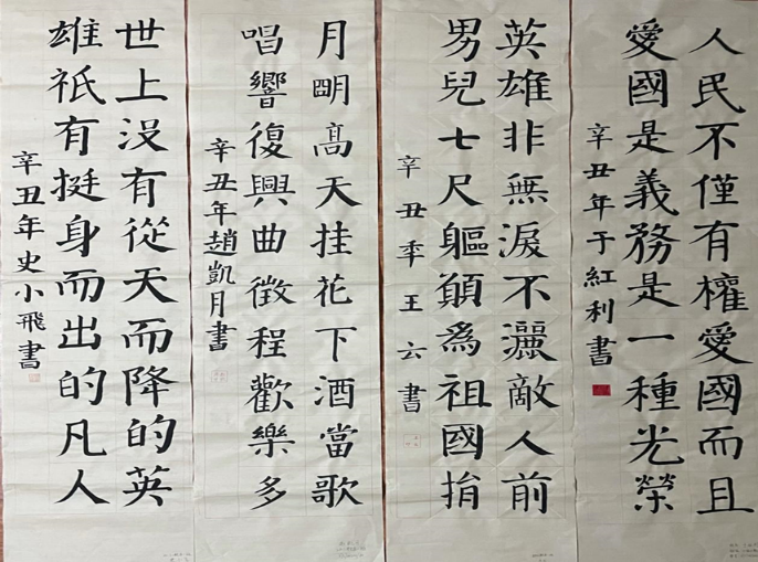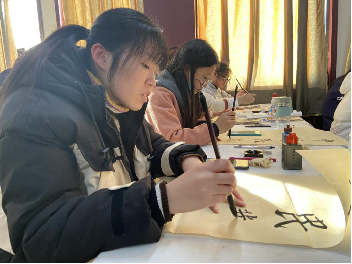 毛笔字、钢笔字书写比赛在育美楼书法教室举行,邀请beat365特聘教授、著名书法艺术家毛鸿雁出席活动。比赛过程中,同学们沉着运笔、一丝不苟,用作品展示软笔、硬笔书法的学习成果,笔墨飞舞间一幅幅优秀的作品缓缓呈现。毛鸿雁教授对参赛选手的作品进行了点评和指导,希望同学们通过毛笔字和钢笔字演绎书法魅力,传承民族文化精髓。她还现场挥毫泼墨,书写了“百年辉煌”4个大字。