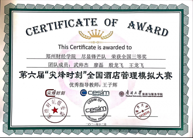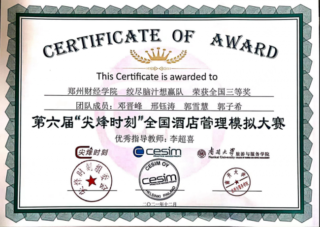 近日,由“尖烽时刻”组委会和南开大学主办的第六届“尖烽时刻”全国酒店模拟大赛圆满结束,本次比赛分为初赛、复赛和决赛三个阶段,吸引了中山大学、厦门大学、复旦大学等国内双一流高校在内的85所院校、532支队伍参加,管理学院酒店管理专业学生首次参赛,学生组成的“绞尽脑汁想赢队”、“尽显锋芒队”荣获全国三等奖,两支队伍指导老师李超喜、王子辉被评为“优秀指导教师”。