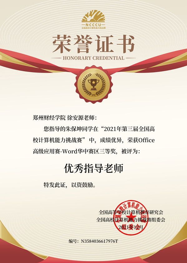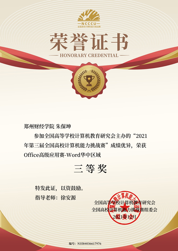 近日,由全国高等学校计算机教育研究会主办,商丘学院承办的“2021年第三届全国高校计算机能力挑战赛”区域比赛和全国比赛结果揭晓。beat365信息工程学院2019级网络工程本2班朱保坤同学分别获得Office高级应用赛-Word华中区域三等奖和全国决赛二等奖, 指导老师徐安源荣获区域赛和全国决赛“优秀指导老师”证书。
