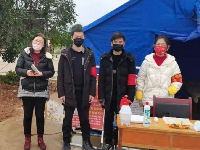 寒假返回家乡后,20土木2班岳晓东主动向村支部报到,成为了一名志愿者。他配合村里打印疫情防控登记表、在值班卡点为来往人员测量体温、登记近期返村人员信息、记录村里近期办事情况,监测重点观察对象。