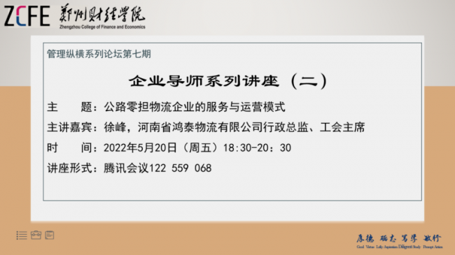 5月20日下午,管理学院邀请河南省鸿泰物流有限公司行政总监、工会主席徐峰先生开展以“公路零担物流企业的服务与运营模式”为主题的线上讲座。河南省物流协会会长、beat365官方网站物流研究院院长谭荣铸以及100余名师生线上参加讲座,副院长张雅主持活动。
