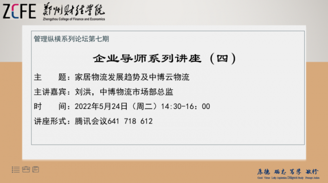 5月24日下午,管理学院邀请河南省物流与采购联合会副会长、河南中博物流有限公司副总经理刘洪为师生作企业导师系列讲座第四讲,管理学院教师、各级物流管理专业学生共计100余人线上聆听了讲座,本次讲座由管理学院副院长胡久贵主持。