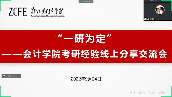 为做好2023年研究生报考服务工作,激发会计学院学生的考研热情,引导同学们树立正确的考研目标,帮助同学们了解和掌握考研趋势与知识,9月24日下午,会计学院举办了“‘一研为定’——考研经验线上分享交流会”,邀请会计学院院长管洲教授、辅导员闫艳以及18级优秀毕业生李佩进行线上经验分享与交流,会计学院党总支副书记王宇、毕业班辅导员和240余名同学参加交流会。会议由辅导员程亚薇主持。