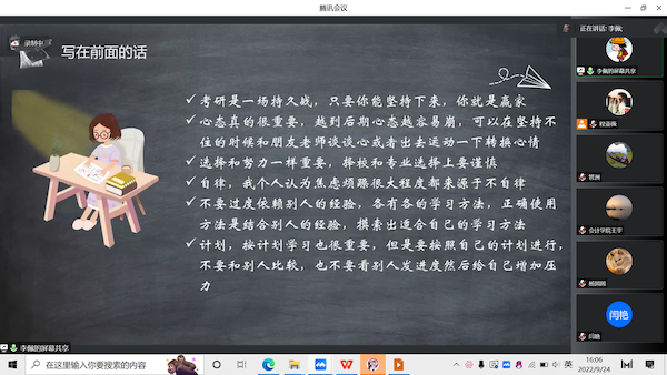 李佩以自身成功上岸的经历向同学们讲述了考研需要做什么、考研择校流程和备考经验,详细介绍了管综的学习技巧,具体分析了英语阅读、写作、翻译、选词填空以及新题型的学习方法。她还分享了一些考研实用的微信公众号、微博号、软件等,让备考学生少走弯路,助力备考学生顺利上岸。