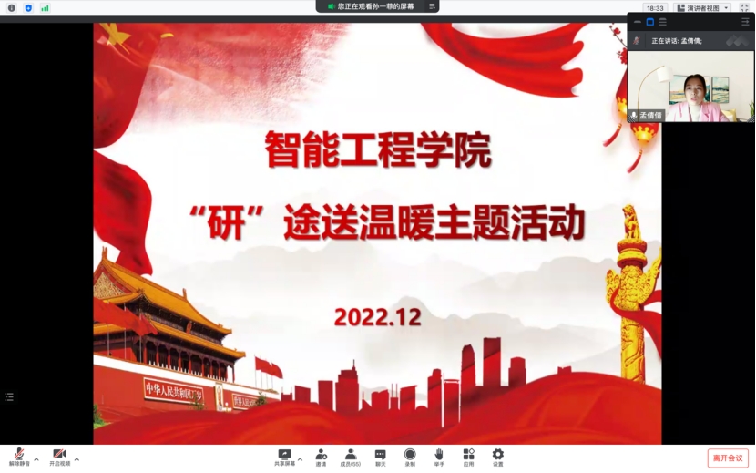 为鼓舞考研学子信心,缓解考前压力,智能工程学院于12月16日开展“研途送温暖,考研一定中”活动,智能工程学院院长刘於勋、党总支书记孟倩倩线上出席活动,毕业班辅导员与50余名考研学生线上参与活动,会议由党总支副书记乔书杰主持。