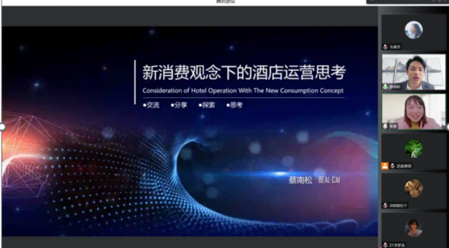 为了使酒店管理专业同学了解新消费观念下的酒店运营理念,帮助同学们熟悉专业发展、把握就业方向,管理学院特邀郑州绿城中州国际酒店总经理蔡南松作题为“新消费观念下的酒店运营思考”的专题讲座。本次讲座采用线上形式开展,管理学院酒店管理专业师生共200多人参加,讲座由管理学院科研副院长张雅主持。