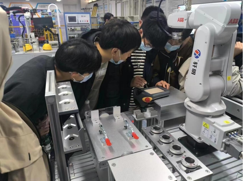 在参观和学习的过程中,河南轩明实业有限公司的工程师们细心地为同学们介绍实验室设备,从国产机器人到ABB机器人,从焊接、搬运、抛光到视觉识别,从外部本体到控制装置再到虚拟仿真,每一个操作都认真讲解、分析到位。并在ABB教学实训台前,手把手教学生操作机器臂,指导同学们编辑一段指令控制机器人运行,同学们都争先恐后地按步骤操作并运行指令。
