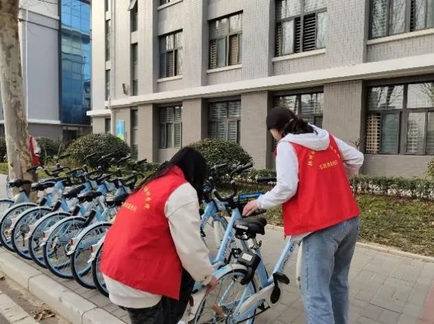 志愿者们热情满满、分工明确,有的对道路上乱停乱放的共享单车进行统一规范的调整,有的借助毛巾、抹布、垃圾钳等清洁工具,对道路两侧、人行道、绿化带里的各个宣传橱窗、休闲娱乐设施等进行清洁整理。志愿者们用自己的实际行动为学校增添一份清新,一抹明亮。