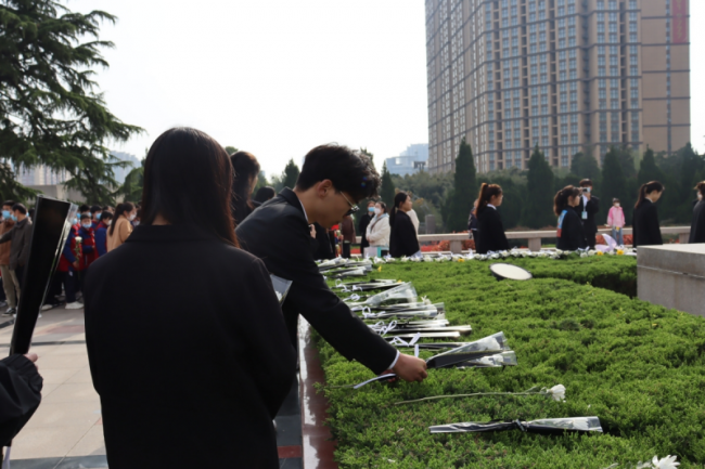 活动伊始,师生整齐有序地进入烈士陵园。手持白花,庄严肃穆,奏唱国歌,向革命烈士致以最崇高的敬意与怀念。