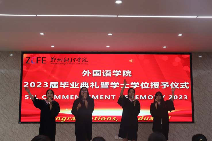 典礼最后,伴随着四名毕业生的倾情献唱,2023届毕业生相拥、相笑、相互祝福和告别,在掌声和祝福中走出外国语学院的舞台,走向更广阔的天地。