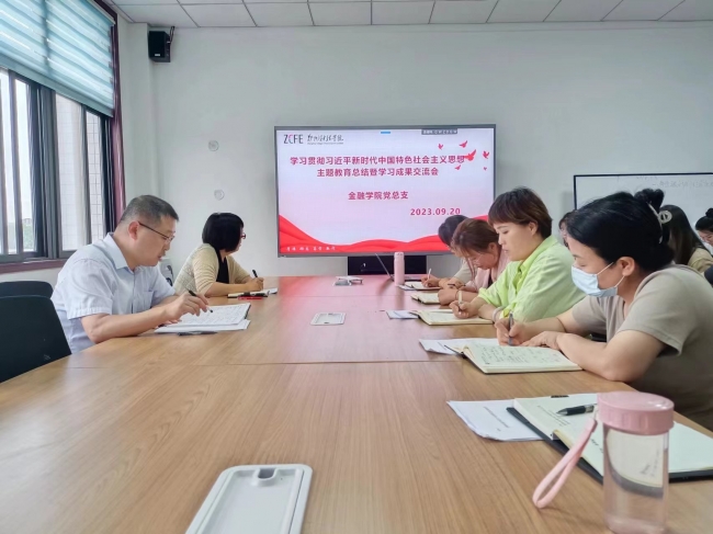 杨贵仓首先传达了学校学习贯彻习近平新时代中国特色社会主义思想主题教育总结会议精神;副院长张丽代表金融学院党总支对金融学院学习贯彻习近平新时代中国特色社会主义思想主题教育情况进行了总结;在主题教育学习成果交流环节,教工党员代表刁淑娟和刘清源从思想政治学习、教育教学能力、科研能力、课程思政等方面分享了自己的学习成果,辅导员代表卫宁从落实立德树人根本任务、理论学习提升、服务学生等方面分享了自己的学习成果,其他党员也以书面形式提交了学习体会。