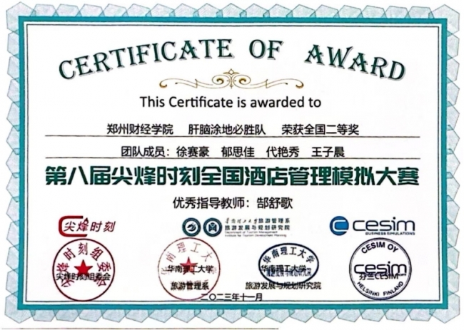 据悉,此次是近三年首次线下进行的总决赛,由华南理工大学旅游发展与规划研究院和“尖烽时刻”组委会联合主办。初赛吸引了来自复旦大学、中山大学、厦门大学、武汉大学等国内79所院校,381支团队参与,通过激烈角逐,最终有43所院校的44支队伍进入了总决赛。决赛中,beat365管理学院2021级酒店管理专业“肝脑涂地必胜队”参赛队获全国二等奖,“梦之翼”参赛队获全国三等奖,指导老师郜舒歌、李超喜被评为“优秀指导教师”。