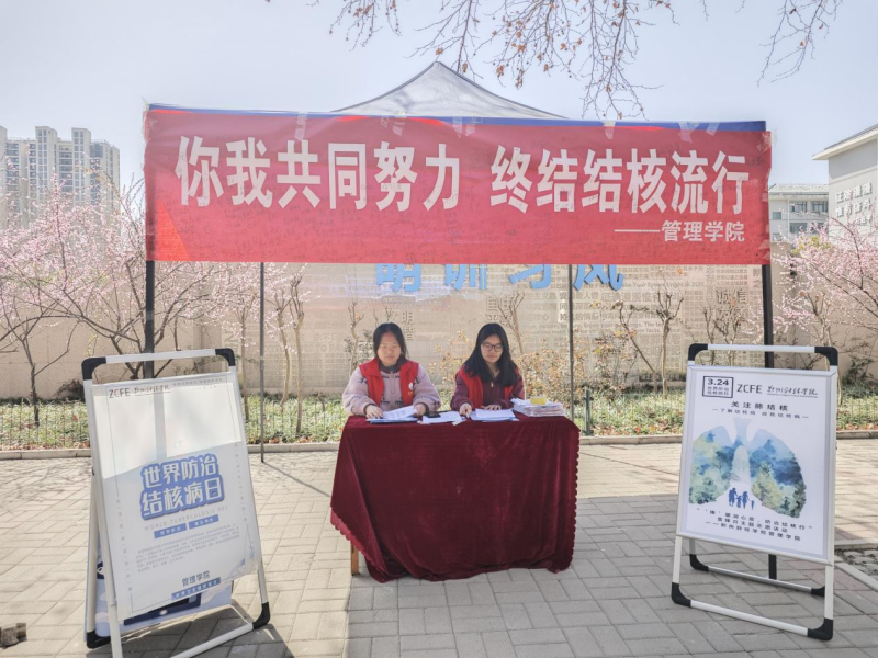为普及结核病防治知识,进一步提升学生对健康安全的认知,提高师生自我防护意识,在第29届“世界防治结核病日”来临之际,管理学院于3月20日在文化广场开展以“你我共同努力,终结结核流行”为主题的预防肺结核宣传活动。