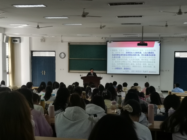 武波教授围绕着中国文化的外宣翻译提出:翻译中国是时代的呼唤,是构建人类命运共同体的重要一环。中华民族伟大复兴也是中国传统文化的伟大复兴。中国文化(特别是中国古典文化)有三大基石:一是道统(道德传统);二是和合(和合方法);三是礼教(礼乐教化)。道统涉及中国人的世界观,和合关乎中国人的方法论,礼教是中华民族生生不息与可持续发展的根本保证。武教授还结合自身多年的研究感悟,深入浅出地讲解了中国传统思想,强调了大学生要多读中国传统经典著作,并向师生推荐了阅读书目。