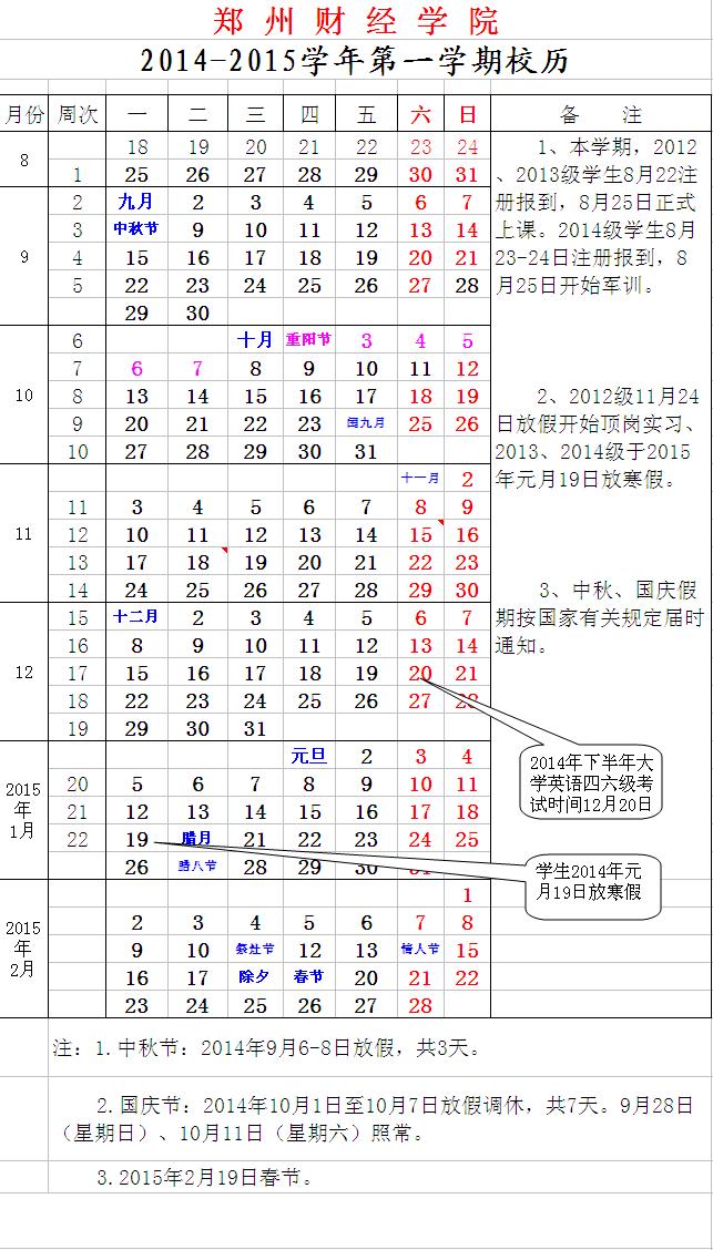 2014-2015学年第一学期校历