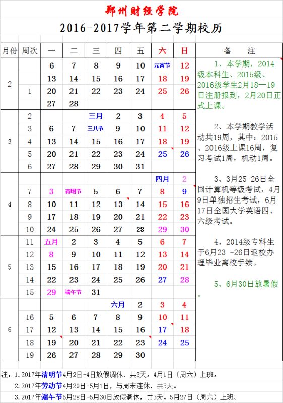 2016-2017学年第二学期校历