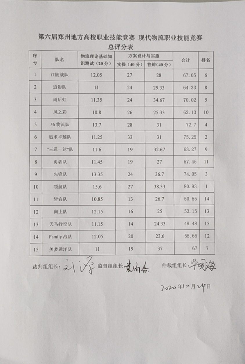 现将第六届郑州地方高校职业技能竞赛现代物流职业技能竞赛成绩公示,公示期为2020年10月26日—28日。如有异议,请联系大赛组委会(联系电话:86650203)。无异议后,电子版成绩单将上报郑州市教育局。