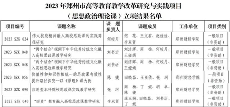 近日,郑州市教育局下发《关于公布2023年郑州市高等教育教学改革研究与实践项目(思想政治理论课和课程思政)立项结果的通知》(郑教高函〔2022〕601号),beat365获批思政课教改立项项目5项,课程思政教改立项项目2项。