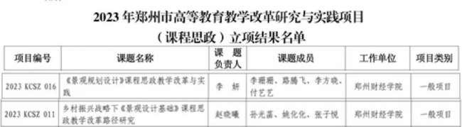 思想政治理论课教改立项项目分别是,何皎月主持的《伟大抗疫精神融入高校思政课的实践路径研究》、刘书圻主持的《“两个结合”视阙下中华优秀传统文化融入高校思政课教学》、陈婕主持的《价值性和知识性相统一的思政课有效性提升路径探究—以<原理>课为例》、张珂主持的《应用型本科院校思政课实践教学研究》、李双贤主持的《“四史”教育融入高校思政课教学研究》;课程思政教改立项项目分别是,赵晓曦主持的《乡村振兴战略下<景观设计基础>课程思政教学改革路径研究》、李妍主持的《<景观规划设计>课程思政教学改革与实践》。