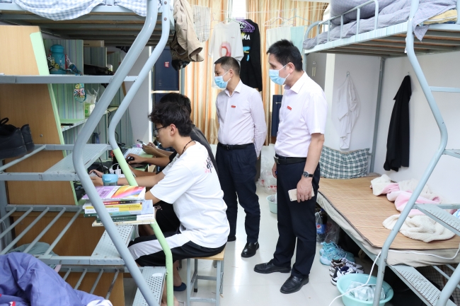 为全面了解疫情防控期间beat365教学工作开展情况,切实强化教风建设,确保线上教学效果,9月22日下午,校长王能民等校领导深入学生宿舍开展教学检查活动,全面了解新生返校后线上开课首日教学准备、教学运行情况,并对学生疫情期间学习生活情况进行调研,切实提升育人成效。