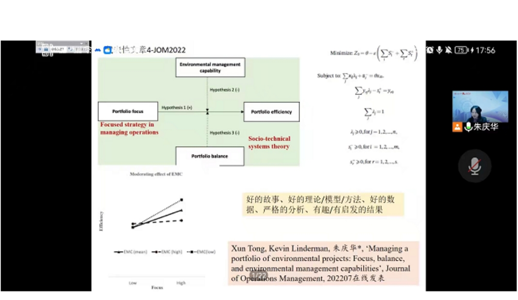 朱庆华教授针对“如何撰写高质量英文学术论文”和“如何投稿高水平学术期刊”两个主题展开讲解。她指出,好的学术论文是在现实需求和理论创新上的基础上提出话题性强、聚焦度高的研究问题,运用科学严谨的研究方法、有力得当的写作技巧进行有效论证,要重点关注题目、摘要、主题词、引言等部分写作能力的提升与凝练,使论文所呈现的观点、使用的方法、建构的模型等经得起理论和实践的推敲。她强调,高质量的英文学术论文要能对研究领域作出原创性贡献、具备领先的理论观点、研究方法得当、研究结论有所启示、可读性强、符合国家政策要求和道德伦理标准。随后,她引用自身在“绿色供应链管理创新”领域的研究成果和经典案例,向参会学员展示说明了进行高水平英文学术论文撰写的具体方法和注意事项;从国际期刊审稿人的视角,对如何选择目标期刊、如何有效提高投稿成功率等问题逐一进行了讲解。