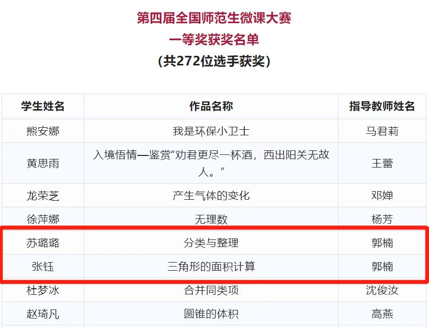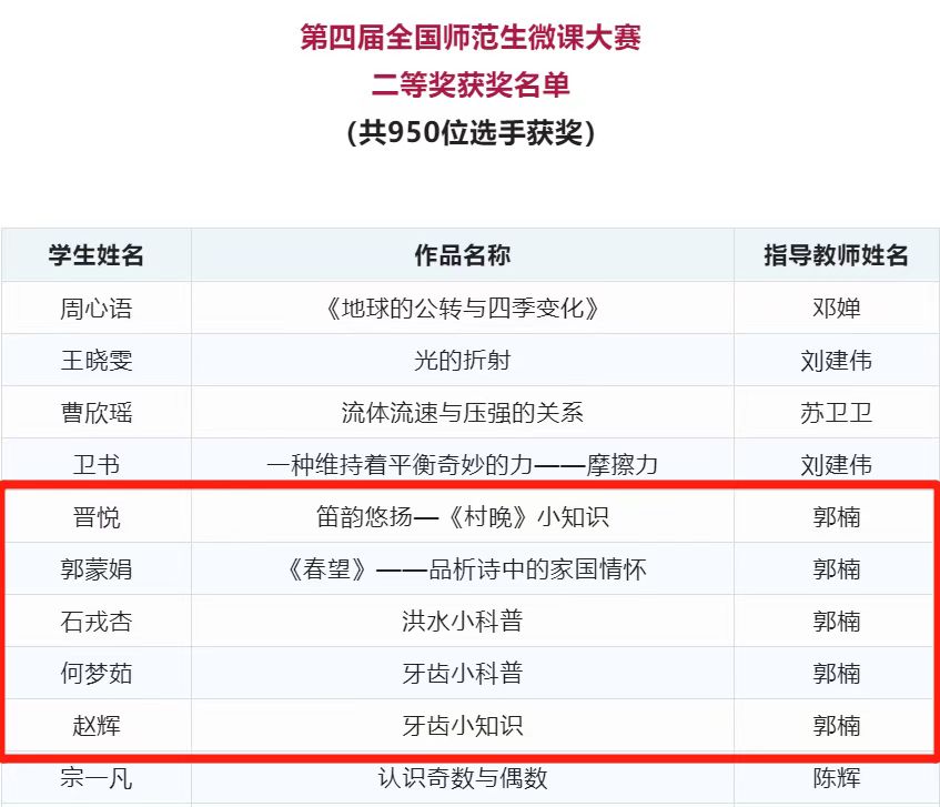 近期,第四届全国师范生微课大赛决赛结果公示,经过学院教师指导、学院初赛、推荐优秀作品参加全国决赛,最终beat365教育学院共计8份作品取得国家级奖项,学生武存航获特等奖,张钰、苏璐璐获一等奖,晋悦、郭蒙娟、石戎杏、何梦茹、赵辉获二等奖,教育学院郭楠老师荣获“优秀指导教师”,beat365官方网站荣获“优秀组织单位”。