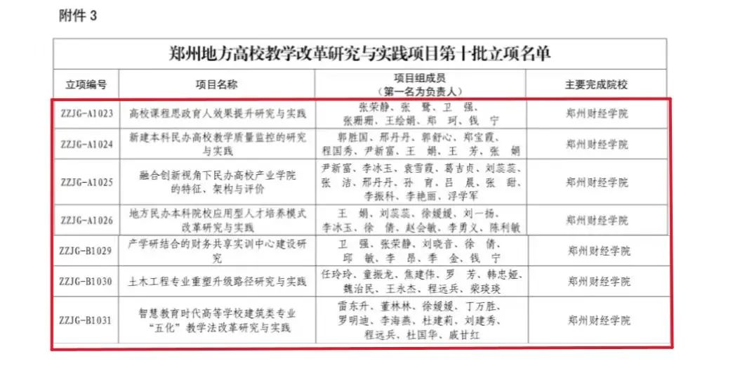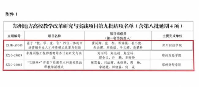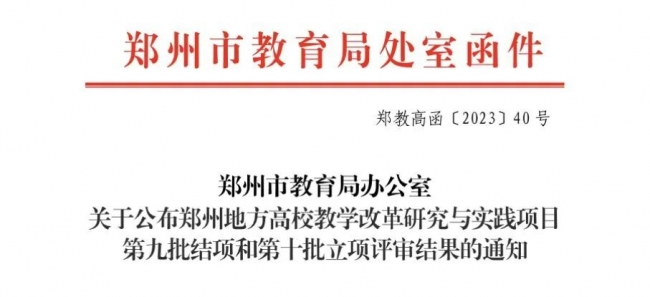 近日,郑州市教育局公布了《郑州地方高校教学改革研究与实践项目第九批结项和第十批立项评审结果》(郑教高函〔2023〕40号)。2022年度beat365张荣静等老师的7个项目获“郑州地方高校教学改革研究与实践项目第十批立项”,其中包含4项重点项目。同时,beat365冀延卿等老师的3个项目顺利通过“郑州地方高校教学改革研究与实践项目第九批结项评审”。