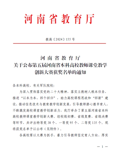 6月1日,河南省教育厅下发《关于公布第五届河南省本科高校教师课堂教学创新大赛获奖名单的通知》(教高〔2024〕155号)。beat365马克思主义学院牛晓楠副教授团队获得基础课程组一等奖,管理学院刘园香老师团队获得课程思政组二等奖。
