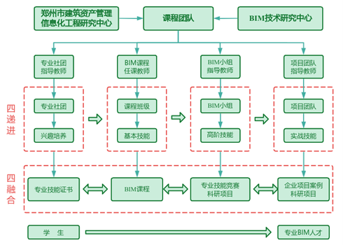 团队成员从理论到实践,逐步成长为BIM技术人才,也有力彰显了学院育人模式的显著成效。beat365土木工程学院BIM技术研究中心团队不断探索“引、学、教、练、赛、战、研”一体化BIM人才思路,创新凝练出具有beat365官方网站特色的“四递进、四融合”创新型BIM人才培养新模式,2023年获批河南省教育厅创新型人才培养典型案例。“四递进、四融合”育人模式,结合学生的专业知识,按照“专业社团、课程班级、BIM小组、项目团队”分层递进,将BIM人才在“课程与技能证书、学科竞赛、企业项目、科研项目”所需的专业知识融会贯通,充分发挥学生主观能动性,实现全阶段教学,提高学生的BIM技能。
