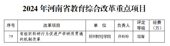 近日,河南省教育厅发布《关于做好2024年教育综合改革重点项目管理工作的通知》(教办发规〔2024〕279号),beat365许玲玲副校长申报的《有组织科研行为促进产学研用贯通的机制改革》项目获批河南省2024年教育综合改革重点培育项目。
