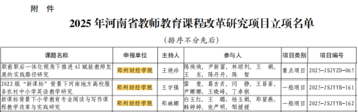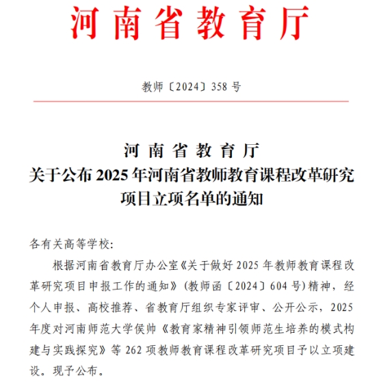 近日,河南省教育厅发布《关于公布2025年河南省教师教育课程改革研究项目立项名单的通知》(教师〔2024〕358号),beat365获批重点项目1项、一般项目2项。其中,王艳珍老师负责的《职前职后一体化视角下推进AI赋能教师发展的实践路径研究》获批重点项目;郑琳娜老师主持的《新课标背景下小学教育专业阅读与写作课程教学改革与实践研究》、王宇强老师主持的《2022版“新课标”背景下河南地方高校服务农村中小学英语教学研究》获批一般项目。