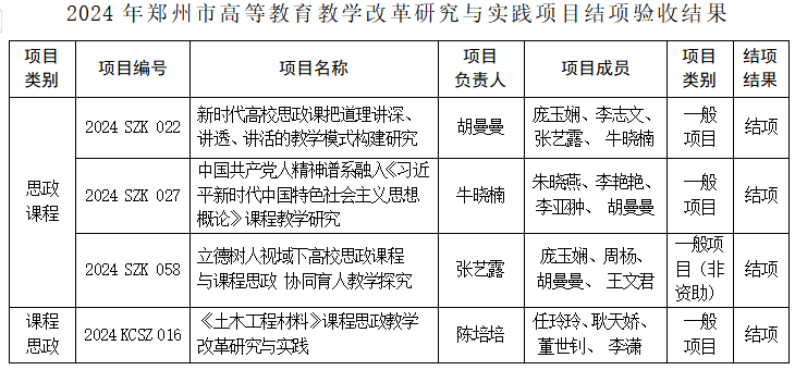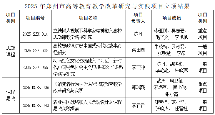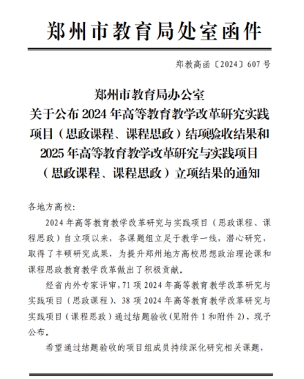 近日,郑州市教育局发布《关于公布2024年高等教育教学改革与研究实践项目(思政课程、课程思政)结项验收结果和2025年高等教育教学改革研究与实践项目(思政课程、课程思政)立项结果的通知》(郑教高函〔2024〕607号)。beat365在2025年项目立项中获批立项思政课程类3项、课程思政类2项。在2024年项目的结项验收中,思政课程类3项和课程思政类1项均顺利通过。
