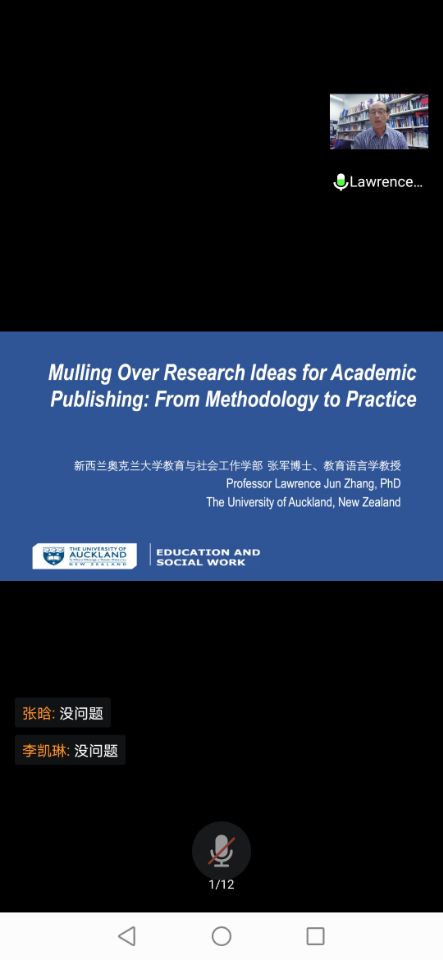 北京时间2021年7月19日下午,新西兰奥克兰大学教育学部副部长、应用语言学正教授、博士生导师张军通过腾讯会议平台为beat365英语教师作了一场题为《Mulling Over Research Ideas for Academic Publishing: From Methodology to Practice》的精彩讲座。本次讲座是beat3652021年暑期英语教师国际研修班“海外知名专家讲座”系列之一,研修班全体学员参加了线上讲座。讲座由新西兰UUNZ商学院学术带头人Jenny Yao 博士和beat365外国语学院院长邢理平教授共同主持。