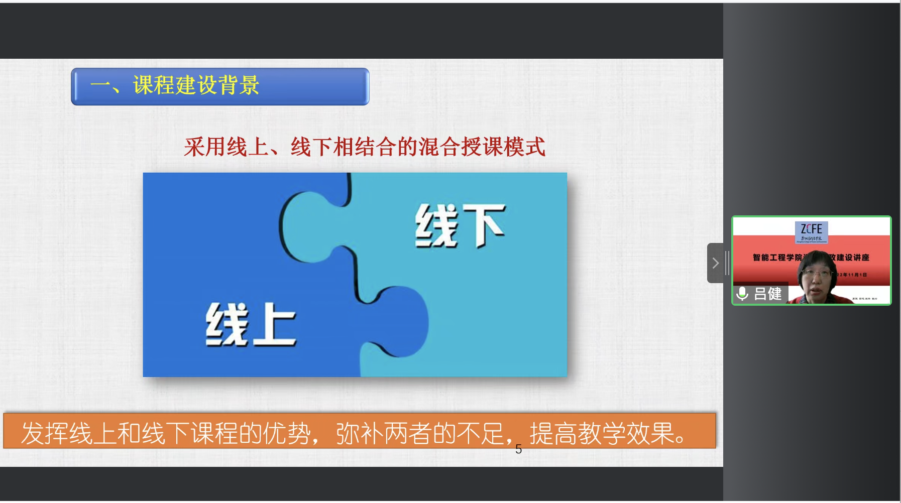 培训会上,吕健教授梳理了党中央、教育部关于课程思政的总体要求和推进轨迹。以大学物理课程思政建设为例,从课程建设背景、课程建设概况、混合式课程实践、凝练理论成果四个方面,分享了课程思政建设经验,为学院教师勾勒了课程思政建设的结构和方法技巧。在示范交流中,她建议教师坚持问题导向、目标导向,紧抓学生思维,引导学生成为研究者;紧扣学生所学专业,引导学生强化成才和担当意识。她强调,做好课程思政首要的是深刻认识课程思政的实质是强调育人,“勘探、采掘”是基础,贵在精准;“冶炼、加工”是关键,贵在精心,解决好“水”中有“盐”的问题。