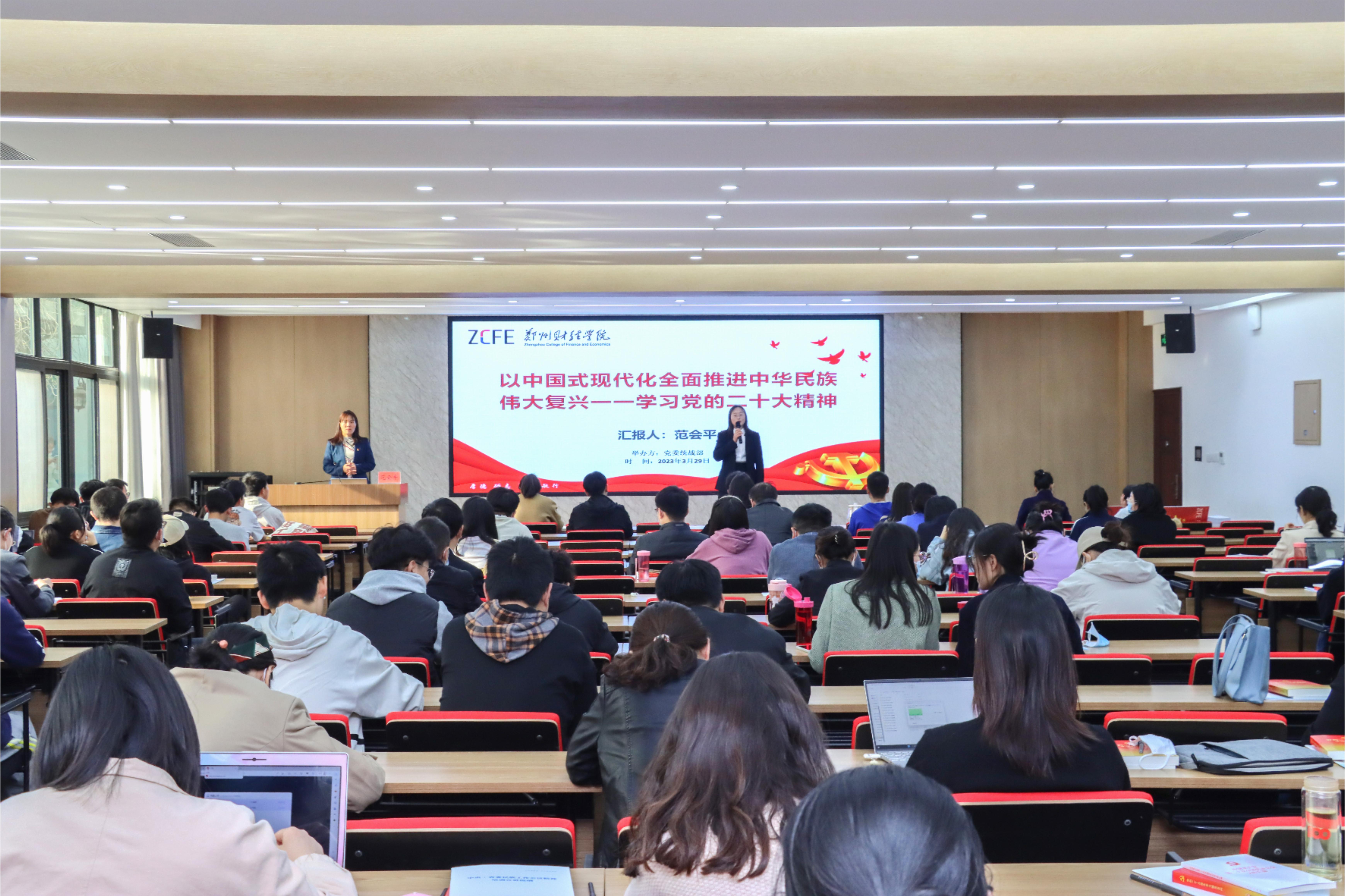 2023年是贯彻党的二十大精神的开局之年,也是统一战线踏上新征程、实现新发展、展现新作为的关键一年,为贯彻落实习近平总书记关于统一战线工作重要指示批示精神,深入学习领会党的二十大精神,3月29日下午,党委统战部特邀郑州文化名家、郑州市委宣讲团成员范会平副教授作专题讲座。有关校领导,各民主党派、无党派及留学归国人员等统战对象参加讲座。讲座由党委统战部副部长王艳杰主持。