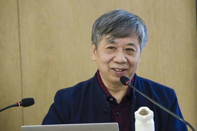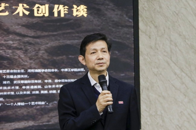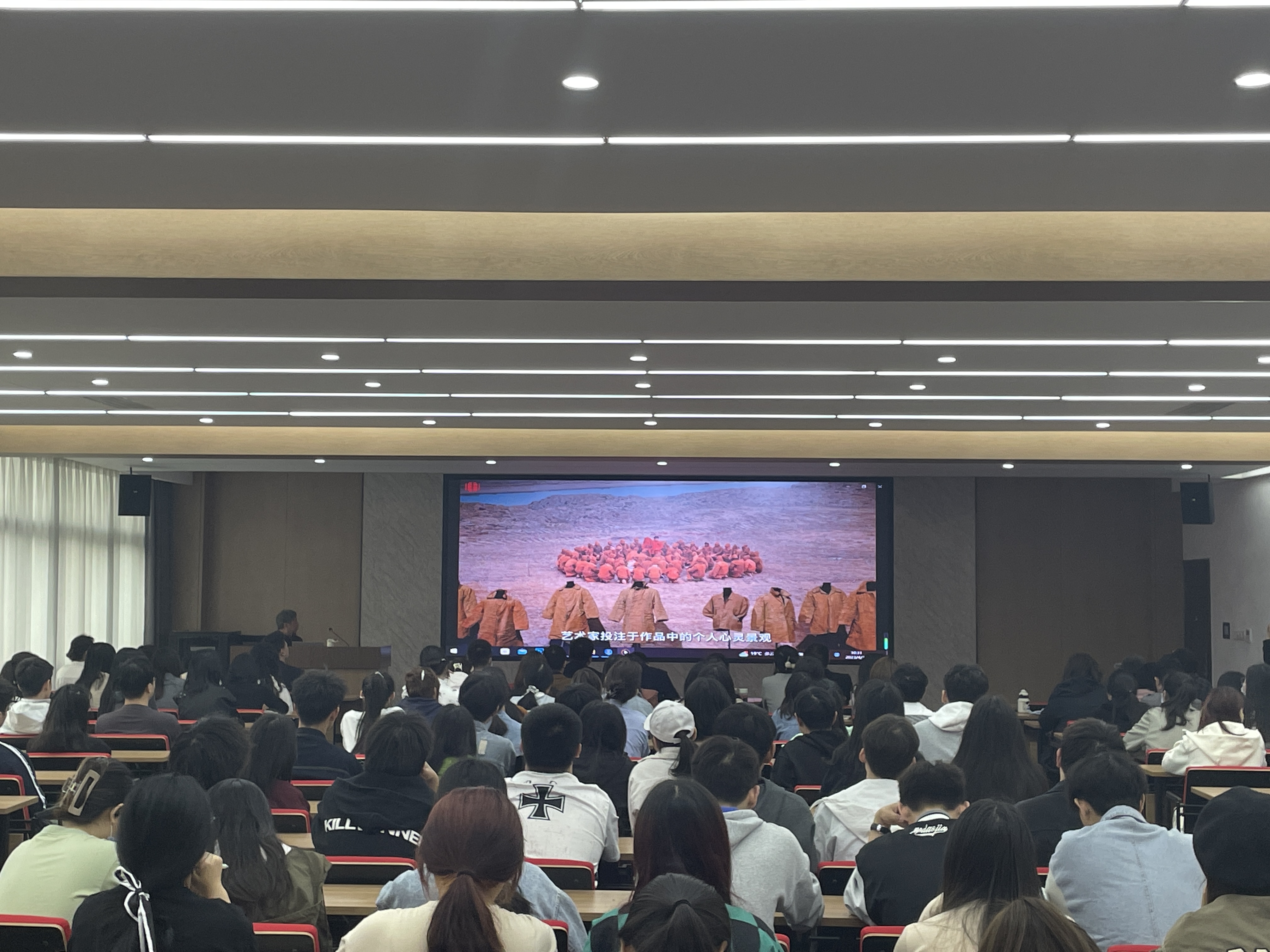 讲座中,王刚教授以农耕文化为切入点,结合图片和视频,就创作思维、作品内涵、创作经历等方面作了介绍与分享。王刚教授的作品以大地为根基、以黄河流域为主题、以基层劳动者为题材,利用油画、综合材料、雕塑、行为艺术等形式,表达其尊重自然、关注民生、追溯黄河文化本源的艺术表达与社会责任,作品宏大、内涵深刻、发人深省。