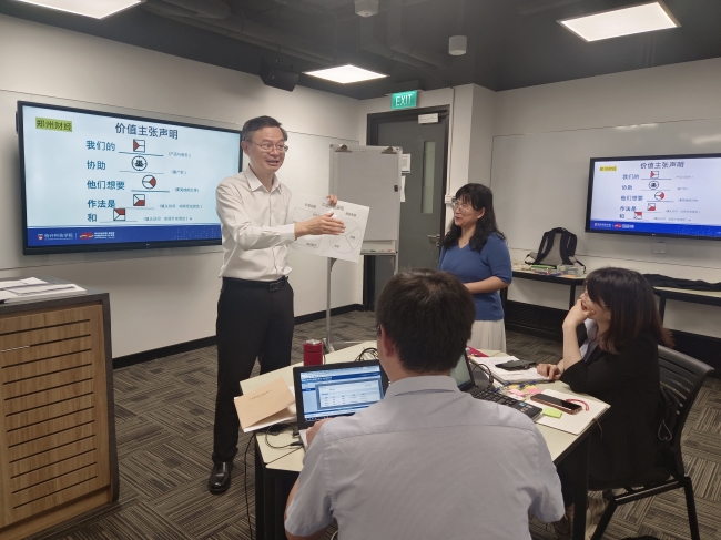下午,新加坡管理学院教务长陈伟权博士为beat365培训团教师带来主题为《如何运用创新思维工具设计思考——结合商业画布管理策划工具解决实际问题》的讲座。陈伟权博士从价值主张和客户信息两个方面展开讲解,引入价值主张画布在麻省理工学院、新加坡国立大学、北京大学等世界著名高等院校中的应用案例,使大家对价值主张画布在解决实际问题中的运用方法有了基本了解。随后,陈伟权博士组织学员们进行小组研讨,学员们积极参与,各抒己见,出色完成了课堂任务与作业提交,并对新加坡“以学生为中心”的教学模式有了更加深刻的体悟。