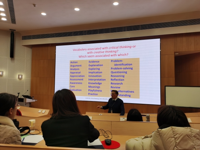 由Martin Cortazzi教授主讲的“Creativity in ELT”、“Critical Thinking in ELT”和“Interculturality in ELT”主题讲座,围绕教师要把培养学生的创造力和思辨力作为重要的教学内容贯穿于英语语言教学全过程,可依托“Situation-Problem-Solution-Evaluation”模式,根据讲授内容,设置具体问题情境,用所教授的语言知识作为载体,创设出需要学生思考、相互讨论交流才能获得新知的学习情景,使学生时而碰壁,时而突破瓶颈,集体智慧评估,最终得出解决问题的方案。教师在设置的情境中,激发学生跨文化意识,引导学生揭露矛盾,尝试从不同角度思考问题,对获得的若干概念重新组合,向各个不同方向延伸,尽可能探索出合乎条件的多种解答。